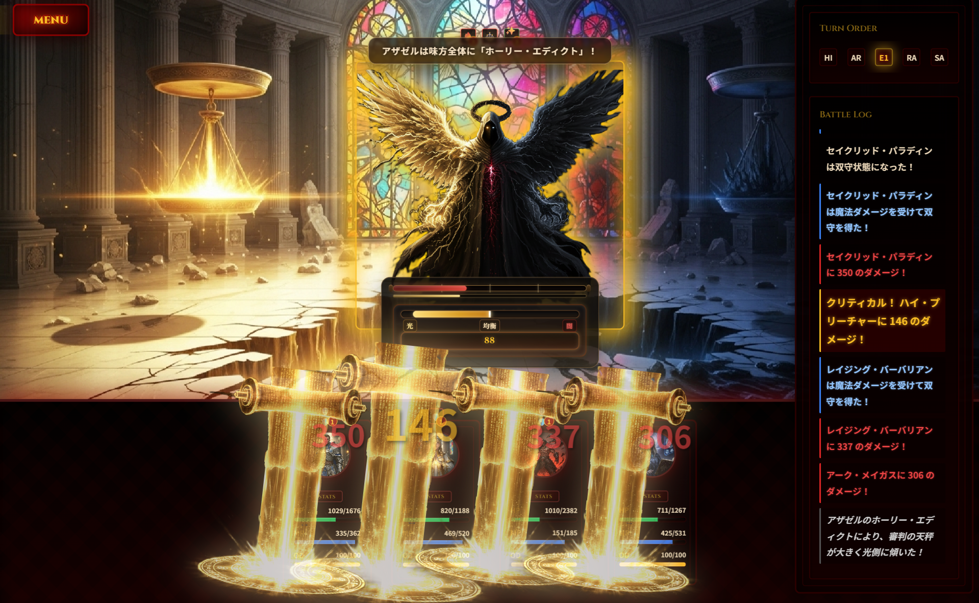 『試練の玉座』は、レベル上げやマップ探索を排除し、ボス戦のみに特化した王道のターン制ボスバトルRPGです。勝利の鍵は、ドロップ品から生まれる無限の「ビルド」と、敵のギミックを攻略する「知略」のみ。